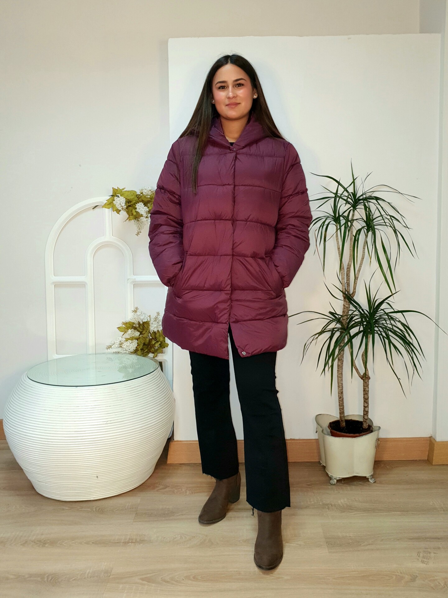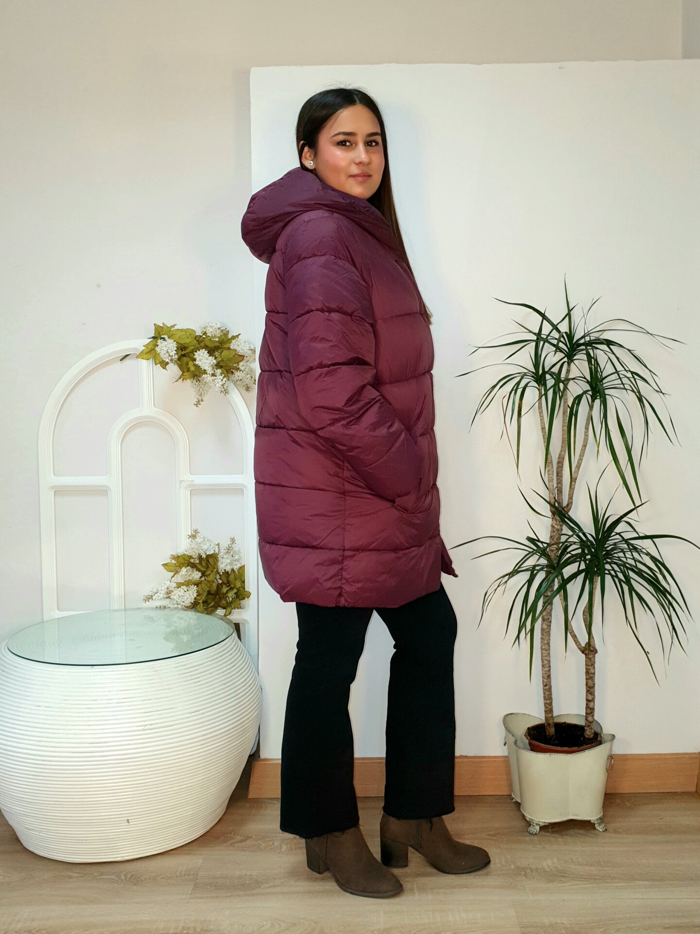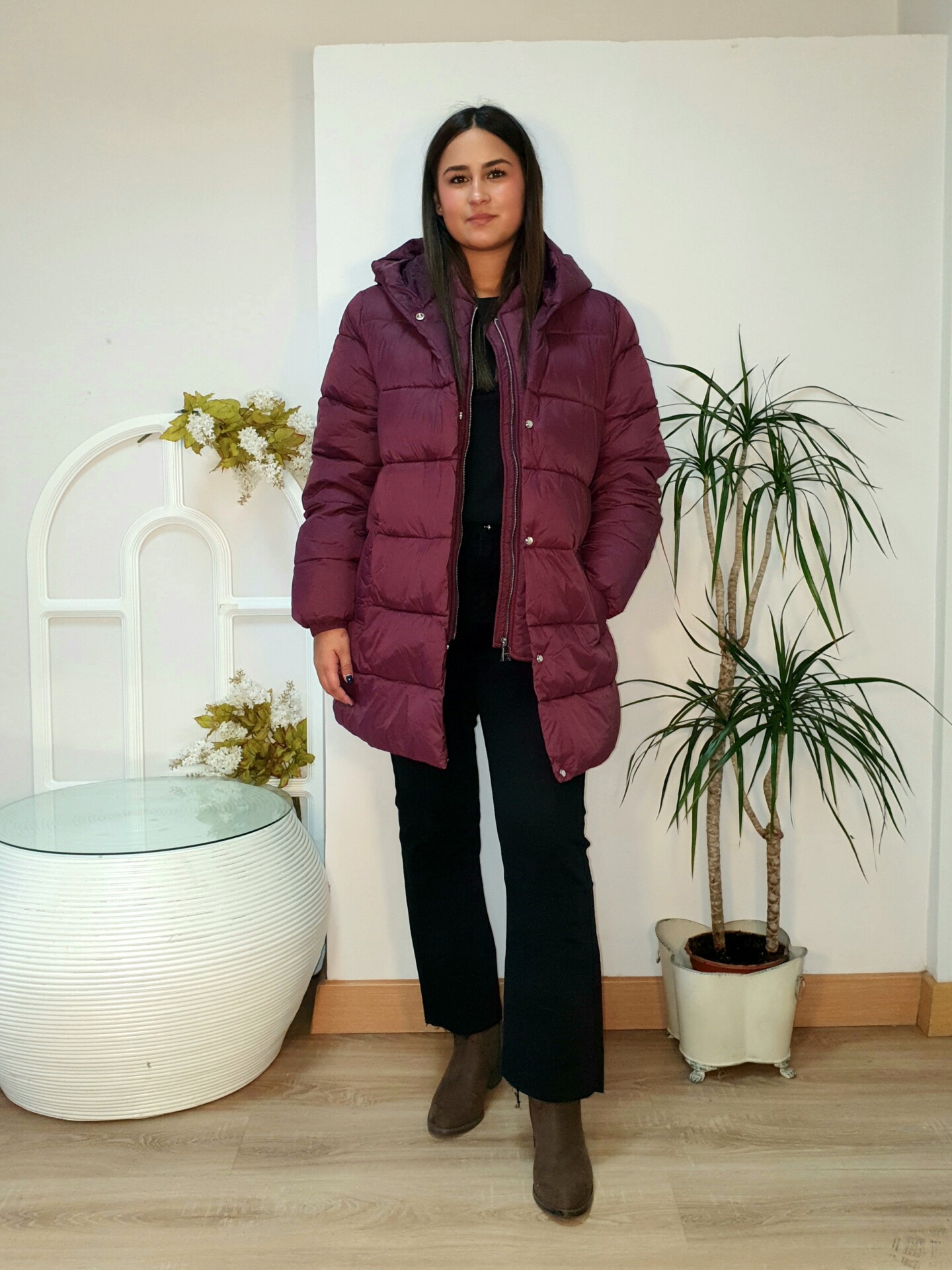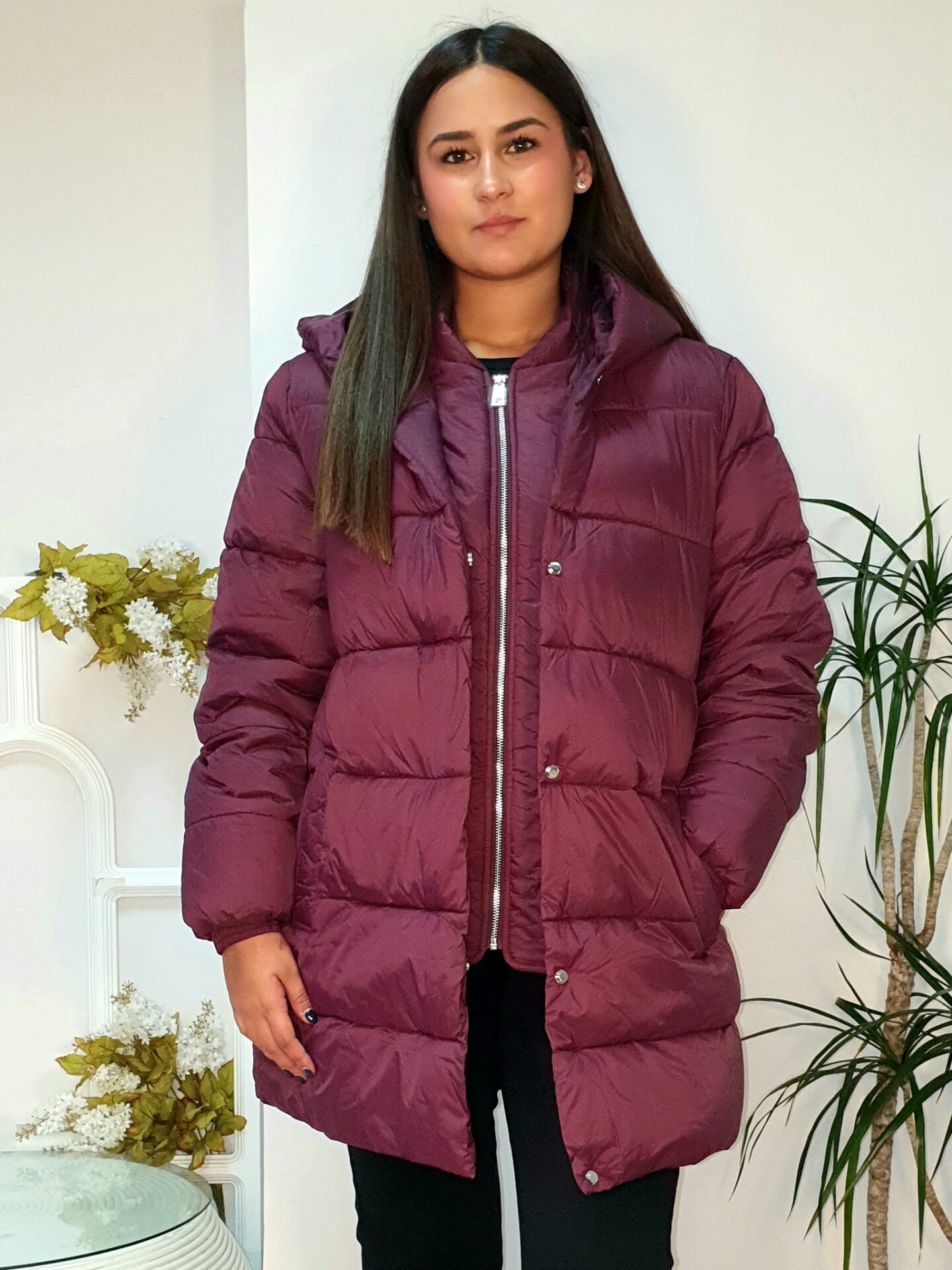 Abrigo largo relaxed fit de nylon acolchado, con dos bolsillos frontales. Cierre de cremallera frontal con tapeta reforzada con botones de presión. Capucha y manga larga con puños elásticos. Interior con tira bandolera.