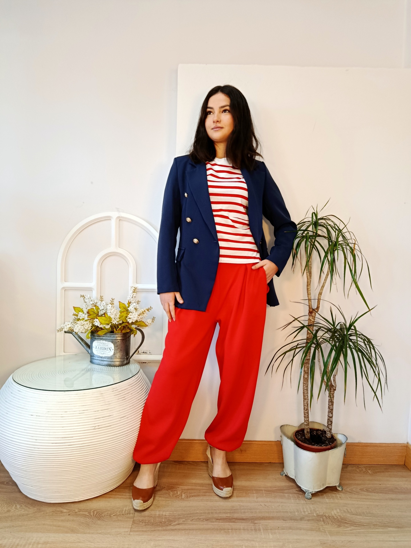 Blazer cruzada Hellen en color marino, de corte elegante y estructura favorecedora. Con botones dorados y diseño atemporal, es la prenda perfecta para elevar cualquier look, desde el más casual al más sofisticado.