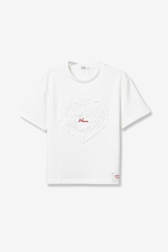 Camiseta super especial, con aplicación de corazón de crochet y bordado en rojo
