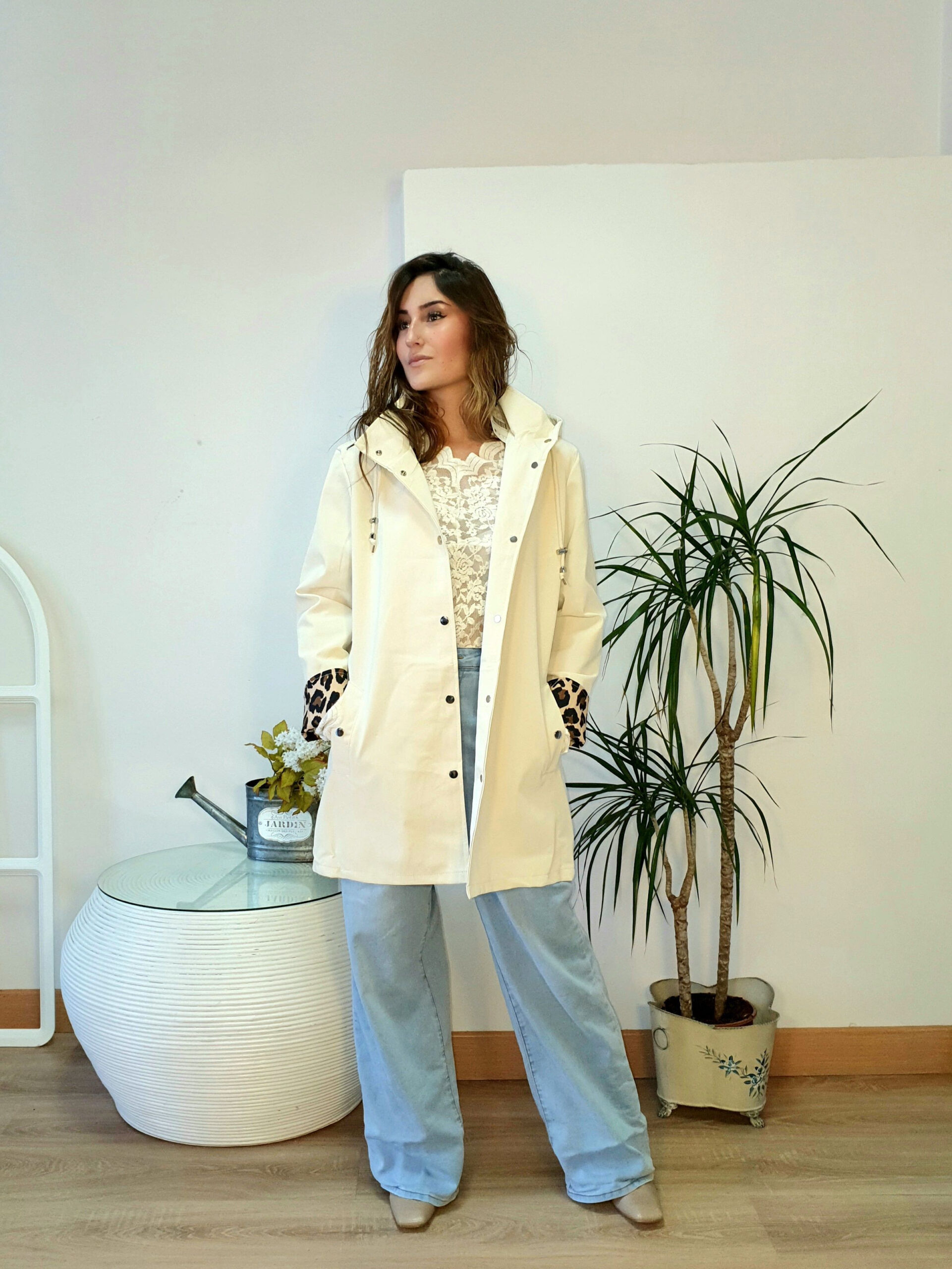 Chubasquero beige con forro de animal print en capucha y en los puños .