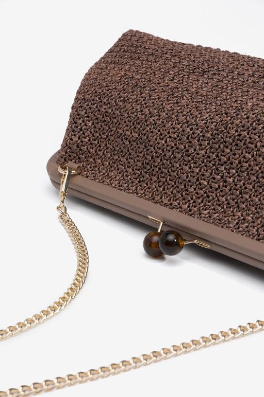 Clutch marrón con textura tricotada, cierre de esferas y cadena dorada desmontable.