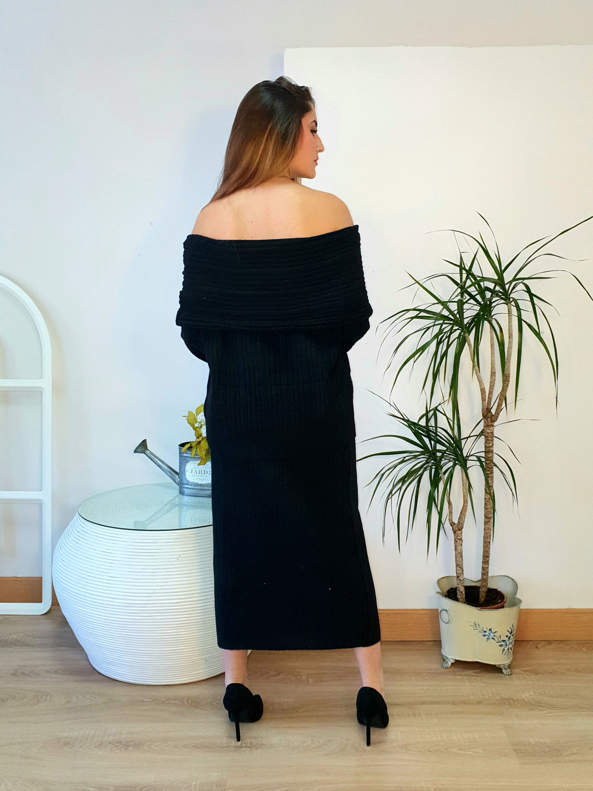 El jersey tiene escote bardot y la falda es recta con goma en la cintura y largo midi.