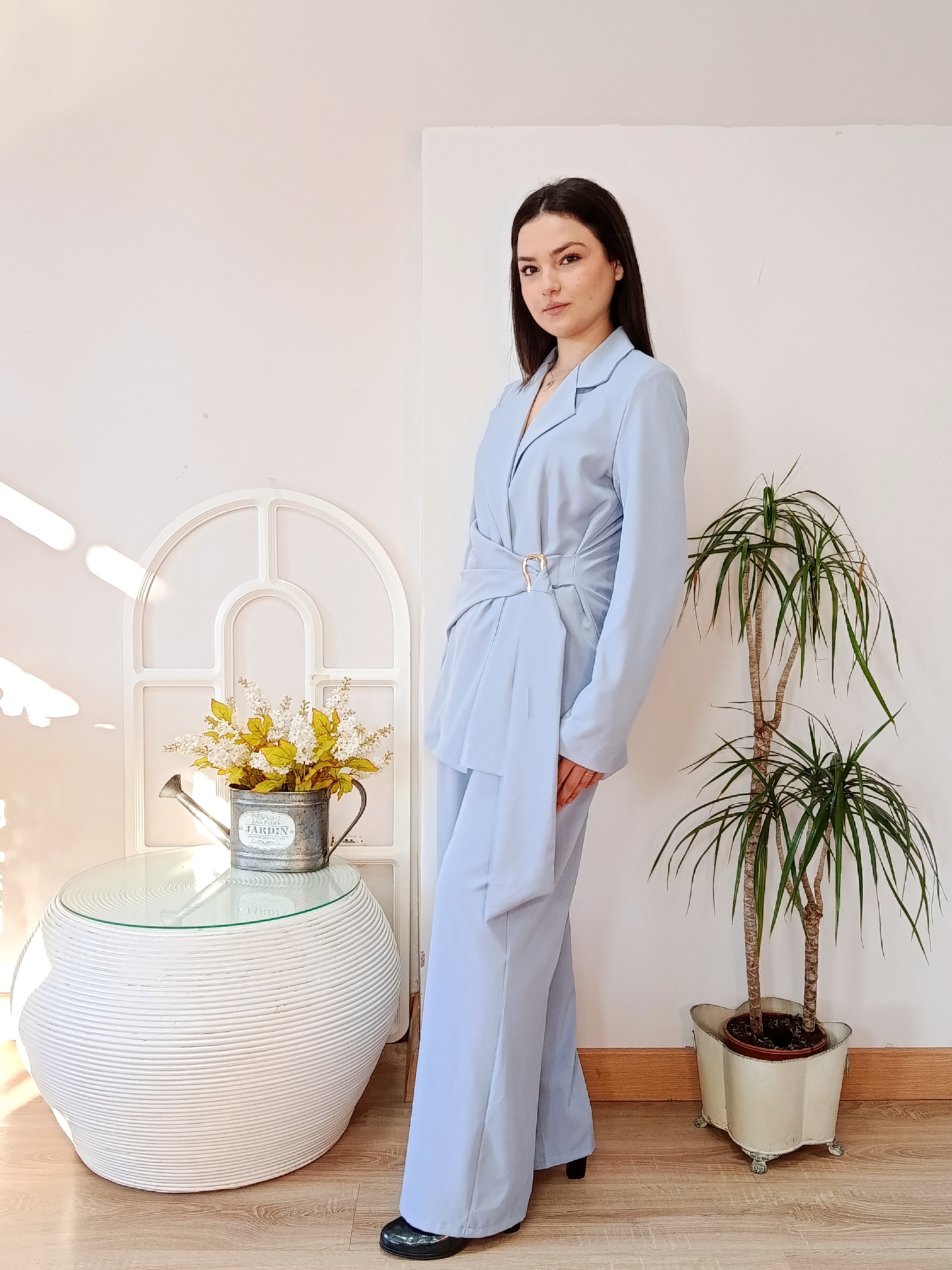 Conjunto de chaqueta tipo blazer cruzada con detalle de hebilla metálica con lazo lateral que realza la silueta, y un pantalón de pierna ancha con hebilla metálica y lazo lateral en cinturilla, sin cremallera ni botones, goma en la parte de atrás de la cintura.