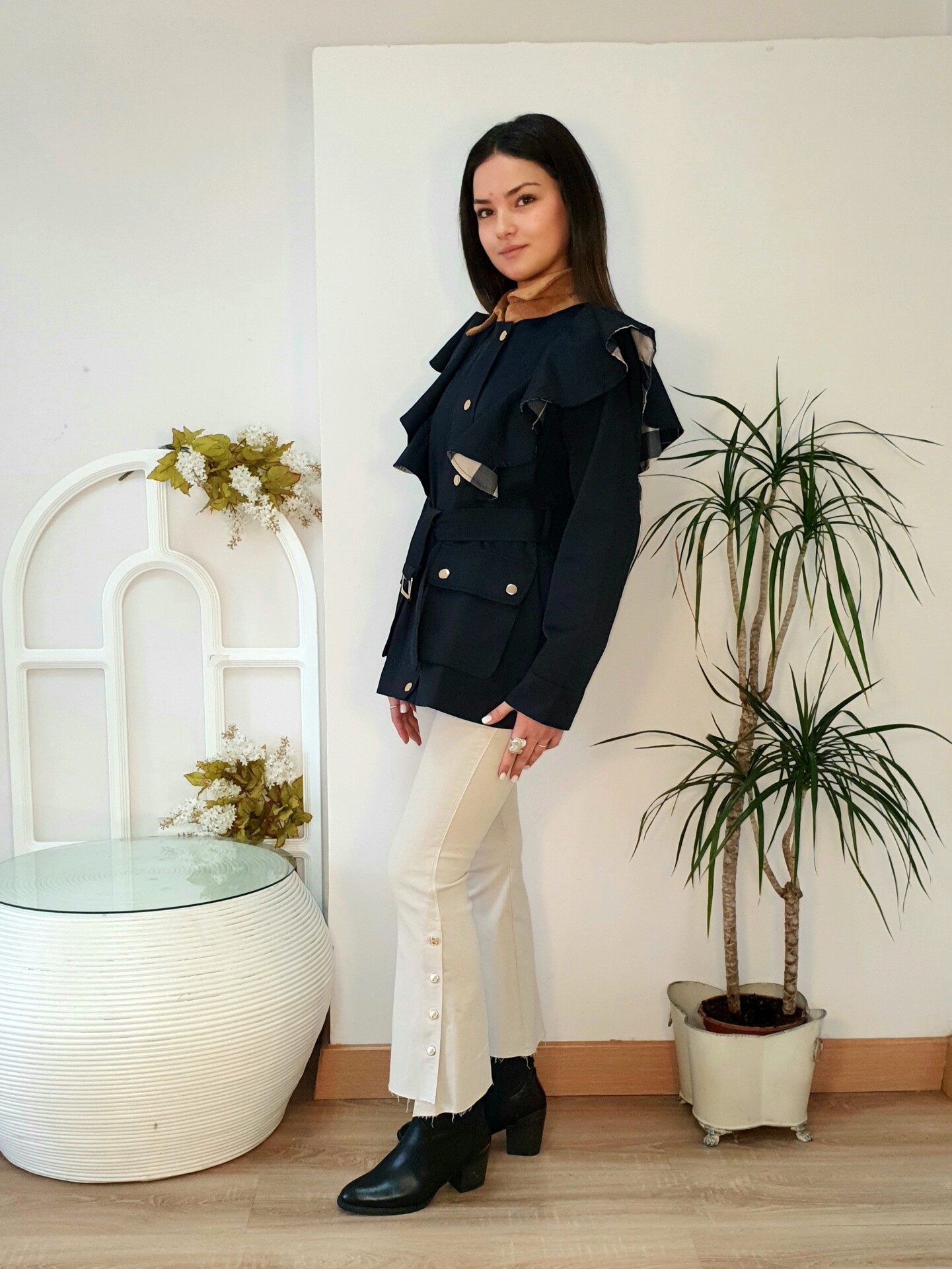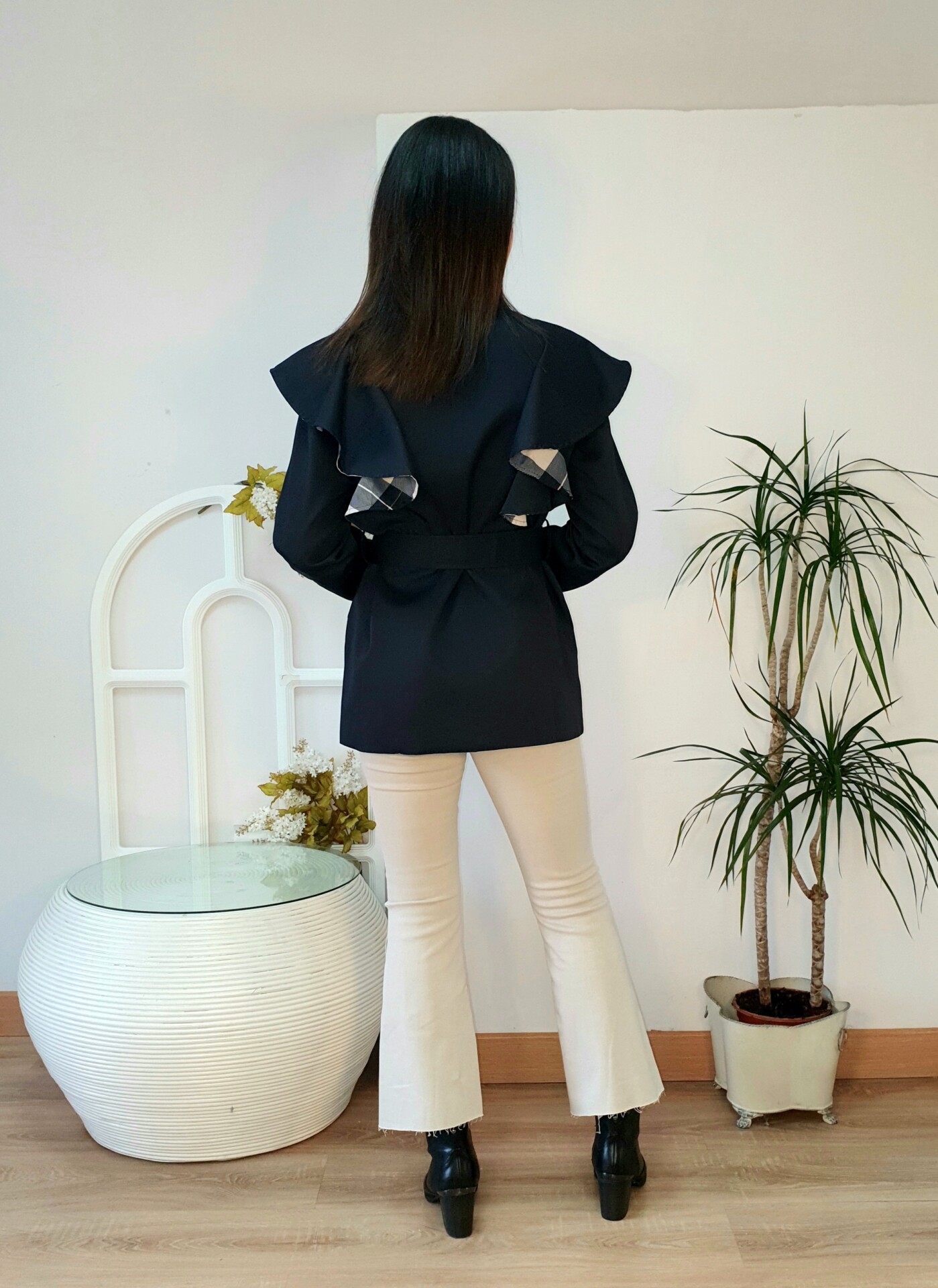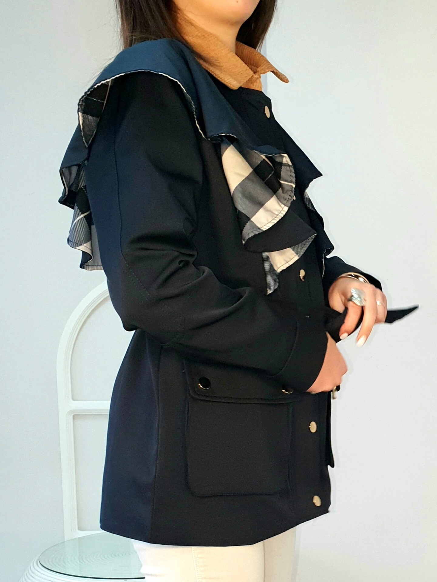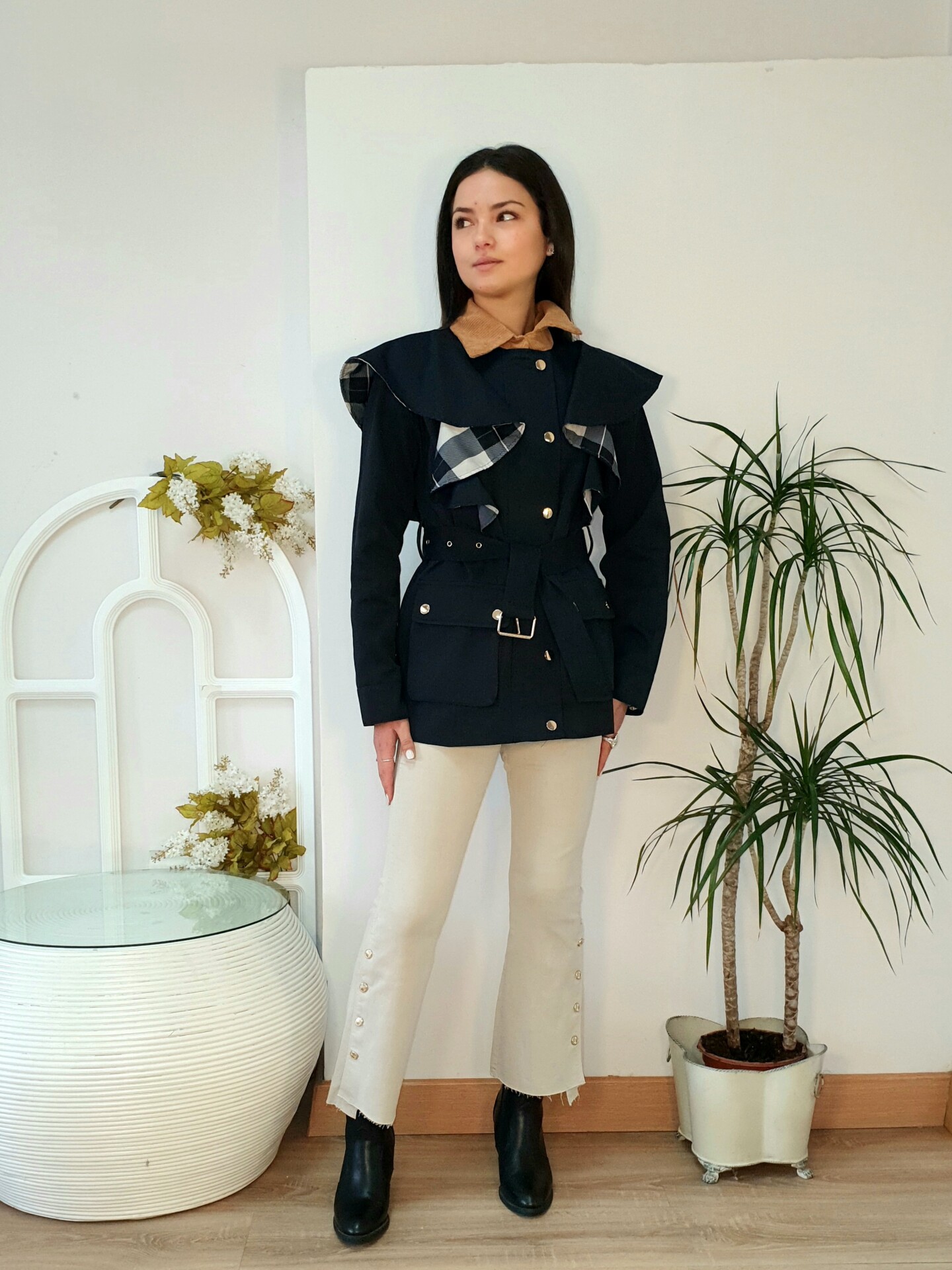 Parka con detalle de volantes en hombros al contraste con el forro de cuadros, cierre con cremallera delantera y botones automáticos en dorado, bolsillos delanteros con botones y cinturón .Cuello y puños en pana.