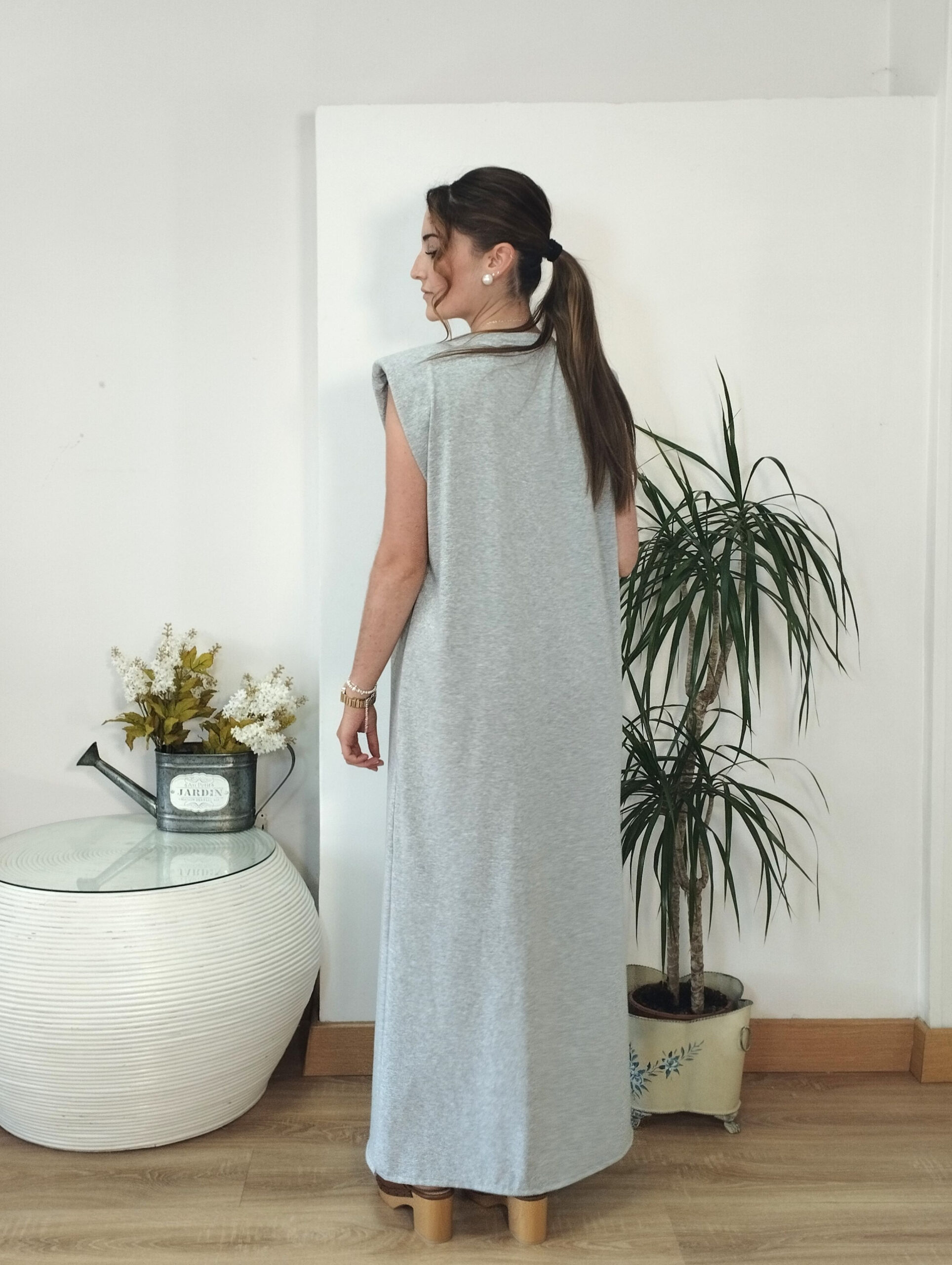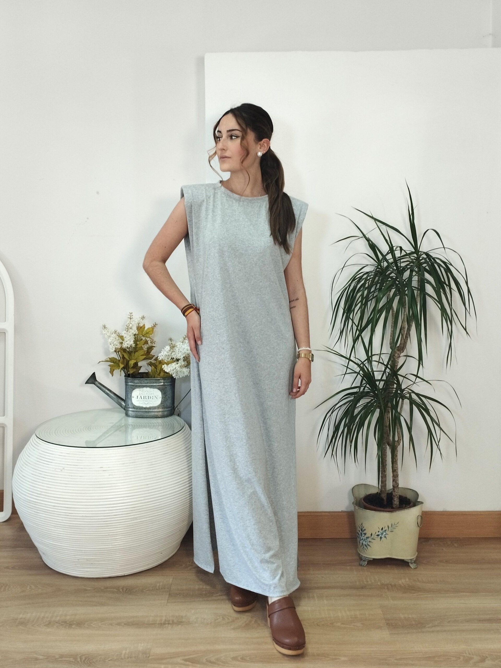 Vestido largo con hombreras, cuello redondo y aberturas laterales